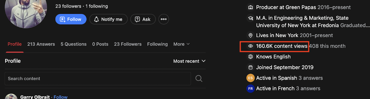 When your Quora answers get views, you can get referral traffic. While it's impossible to guarantee traffic, high-quality and relevant answers can lead targeted users or even customers to your site.