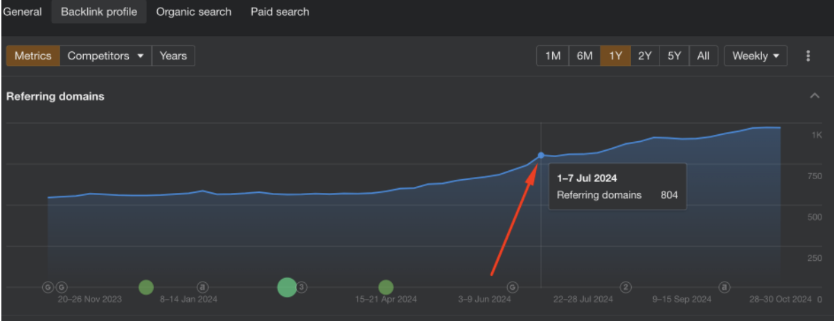 Before initiating our efforts, the site had 804 referring domains, with a history of gradual growth, indicating a successful strategy of consistent link building. This gradual increase in backlinks contributed to a natural link profile, enhancing trust from search engines. We decided to continue this “drip strategy” of link placement to sustain organic growth and further establish the site’s authority.
